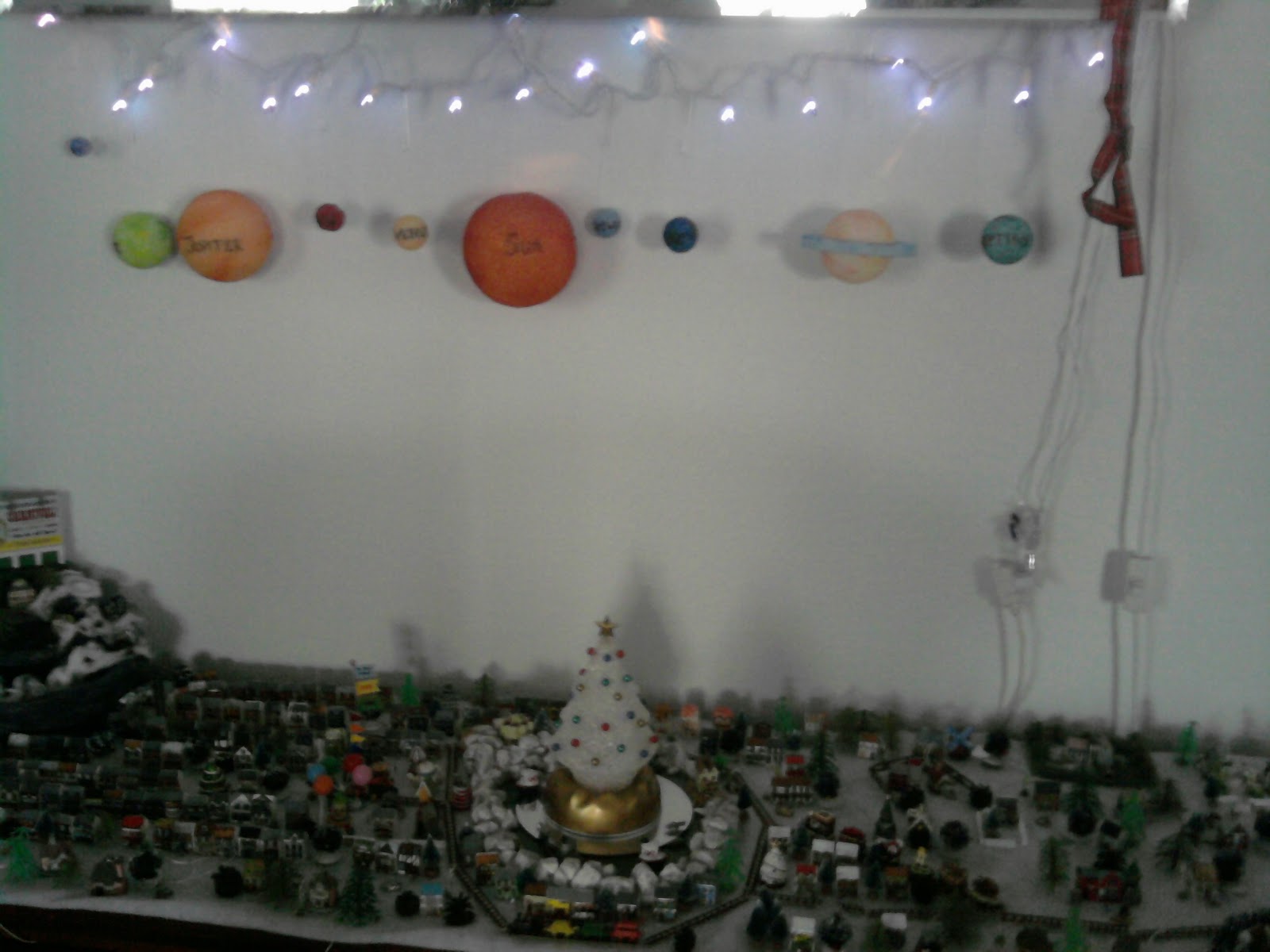 She wasn’t kidding. She made the entire solar system out of Styrofoam balls. It was awesome! However, when I got the gift(s), my tree was already up, and I wanted to display her gift. I looked around. Above Thimble County on the original console stand is a light-up picture that has air vents around the frame. I hung a set of blue lights (for stars) from the bottom of the light, and hung the planets from that--over top of Thimble County .