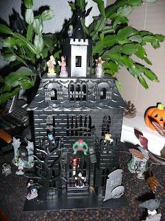 The creepy house with many movie things. Even a pirate and treasure. A ghost stands outside her tomb.